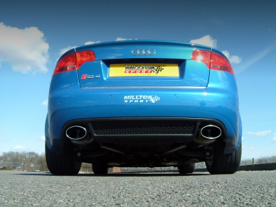 MILLTEK PERFORMANCE Edelstahlabgasanlage ab Katalysator - Mittelschallldämpfer schallgedämpft ohne Klappensteuerung mit Endrohr Optik li / re Oval 105 mm x 95 mm poliert für - Audi, A4 (8E,B7), RS4 quattro (Baujahr 2006-)